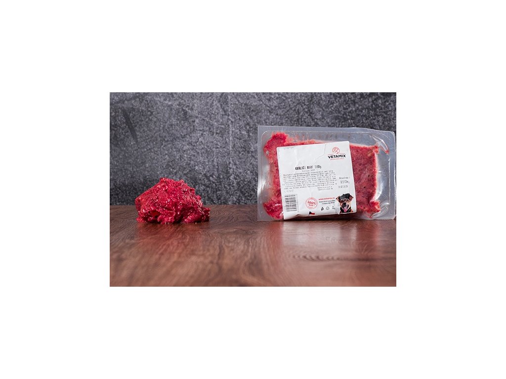 Náš králičí BARF obsahuje kvalitné, ľahko stráviteľné králičie mäso bohaté na bielkoviny v ideálnom pomere svaloviny, drobov a kostí. To celé ešte doplnené kvalitným ovocím a zeleninou z českých záhrad a ryžovou múkou, ktorá je vhodnou hypoalergénnou prílohou.