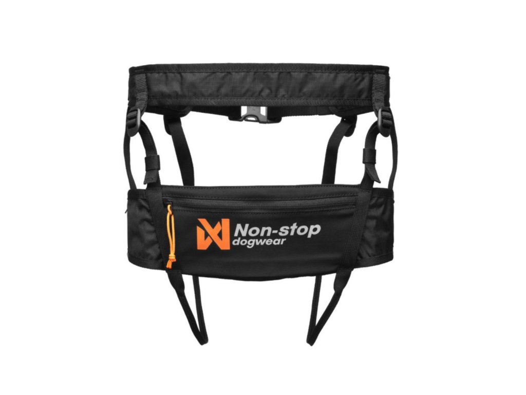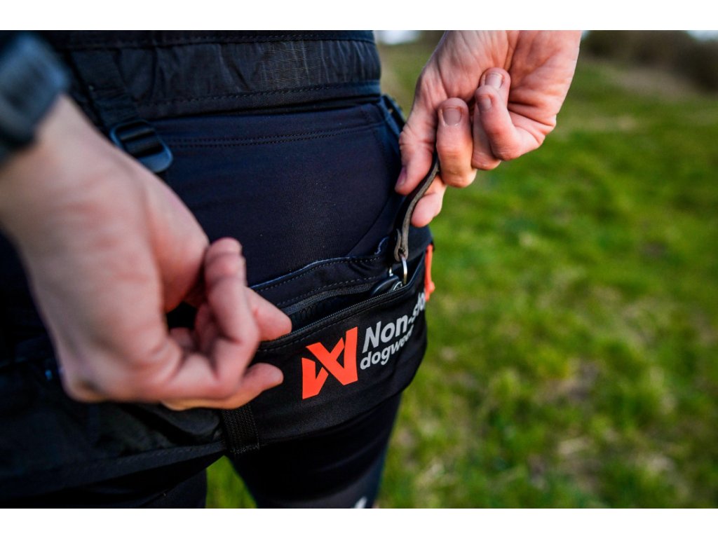 Karabína nie je pevne upevnená k opasku, ale kĺže po popruhu v prednej časti opasku, takže sleduje pohyb vášho štvornohého parťáka a vyrovnáva ťah a tlak na vašich bokoch, aj keď pes nebeží v strede.