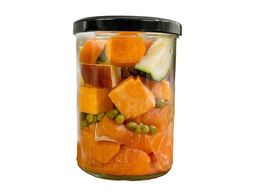70 % varený losos, 7,4 % sladké zemiaky, 6 % mrkva, 6 % hrášok, 4 % jablká, 3 % cuketa, 1,5 % lososový olej, 1 % hovädzia pečeň, 0,4 % šípka, 0,4 % limetka z rias, 0,1 % pivovarské kvasnice, 0,1 % múčka z morských rias, 0,1 % šalvia