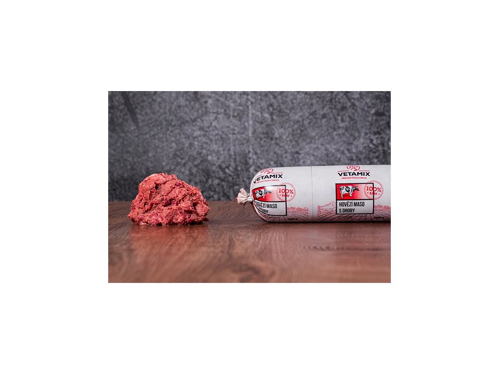 Vetamix jemne namleté hovädzie mäso s drobmi pochádza iba od overených lokálnych farmárov. Nebojte sa podávať ho aj psom a mačičkám s diétou alebo so zažívacími problémami.