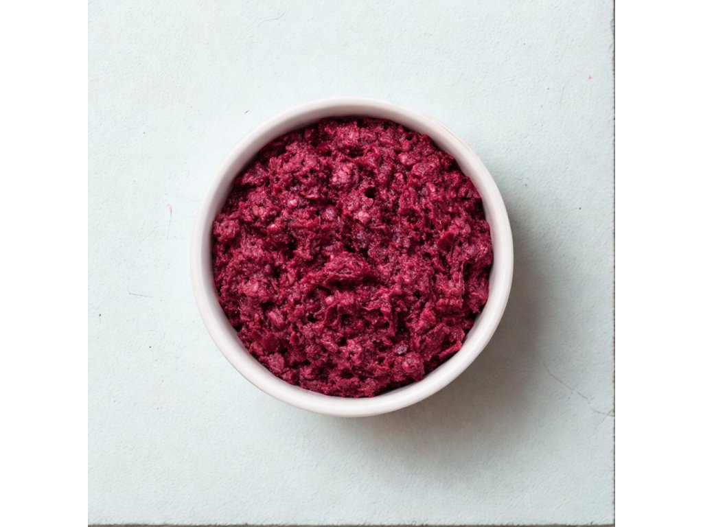 Hydinová zmes s červenou repou je chutná a výživná kombinácia hydinového mäsa a zeleniny vhodná pre prirodzené kŕmenie psov metódou BARF (Biologically Appropriate Raw Food).
