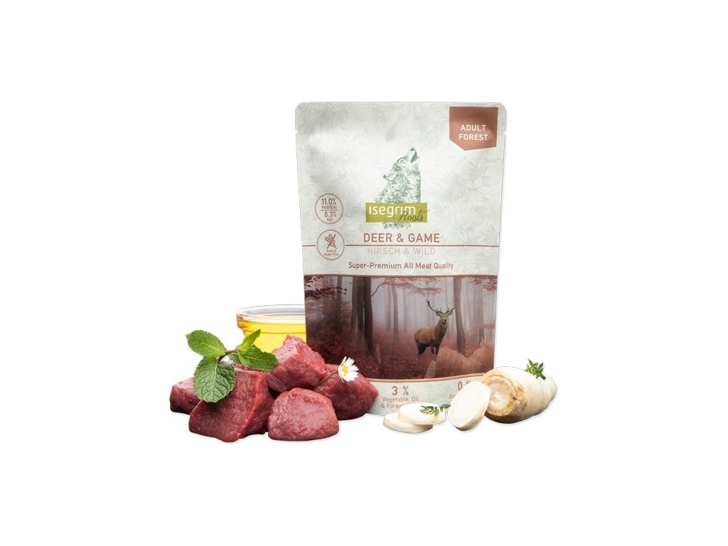 ZLOŽENIE: 35 % jelenie mäso, 35 % divina, 27 % vývar, 1,5 % petržlen (koreň), 1 % minerály, 0,3 % lesné byliny, 0,2 % svetlicový olej.