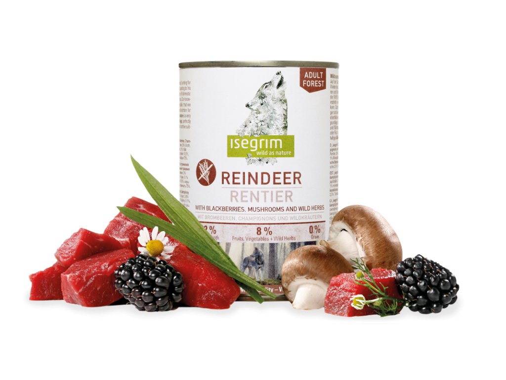 Exkluzívne prírodné sobie mäso je dokonalým zdrojom bielkovín tejto kompletné konzervy. Kombinácia ostružín, húb a divokých bylín predstavuje všetko, čo pes potrebuje pre svoje zdravie.
