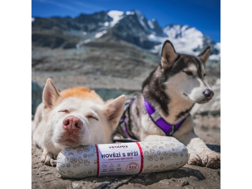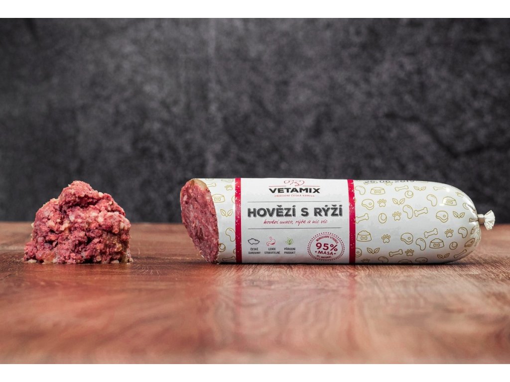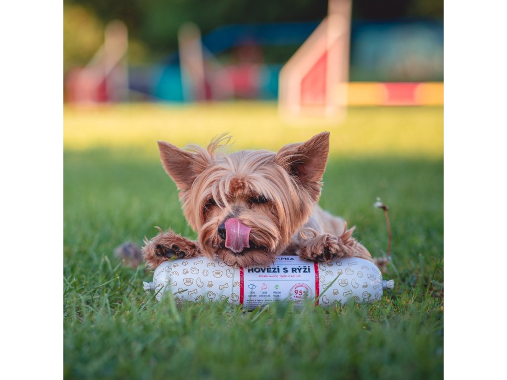 Šetrne sterilizovaná saláma plná kvalitného hovädzieho mäsa je skvelou alternatívou krmiva, keď práve nemáte po ruke mrazničku na klasický BARF. Salámu Hovädie s ryžou využijete ako doma, tak aj na cestách s chlpáčom. Obsahuje 95 % hovädzieho mäsa z lokálnych zdrojov,bohatého na dôležité proteíny a ľahko stráviteľné tuky. Zvyšok tvorí kvalitná biela ryža, ktorá je ideálnou hypoalergénnou prílohou. Bez obáv ho môžete dopriať aj psom a mačkám s alergiami alebo zažívacími problémami.
