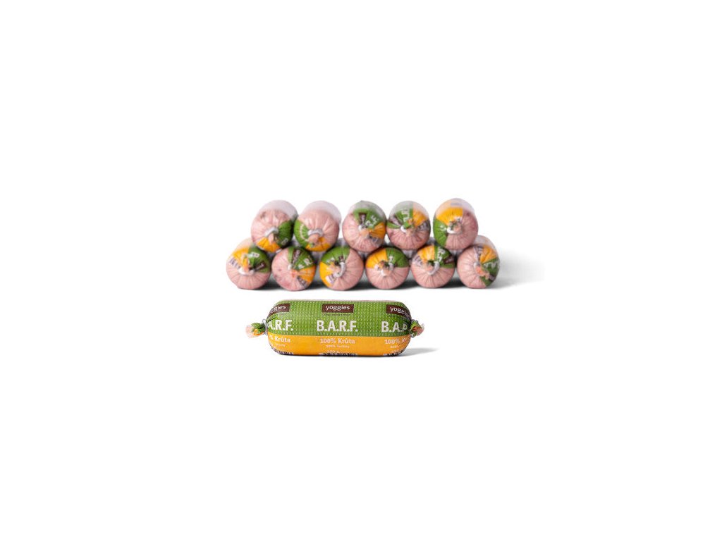 Surové kompletné krmivo pre psov (Yoggies B.A.R.F.) s probiotikami. Receptúry sú vyvinuté tak, aby sa čo najviac podobali prirodzenej potrave psa a obsahujú iba kvalitné mäsa z kontrolovaných chovov. Surové mäsa Yoggies B.A.R.F. obsahujú špeciálne probiotiká pre psov, ktoré podporujú imunitu i odolnosť proti vírusom, parazitom i chorobám a pridaná je aj kĺbová výživa, ktorá podporuje stavbu kostí i zdravie pohybového aparátu psa.